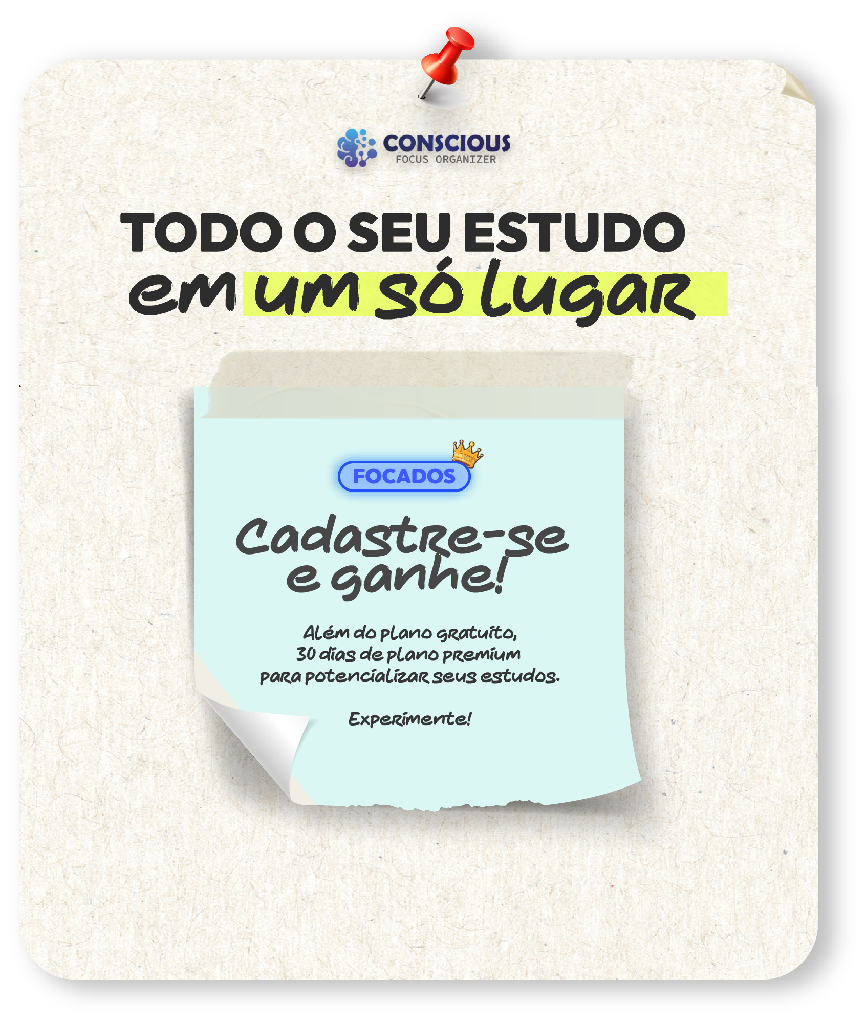 Pomodoro, Músicas de Foco, Revisões Automáticas, Manuais, Acompanhamento de Progresso, Post-its, e muito mais .